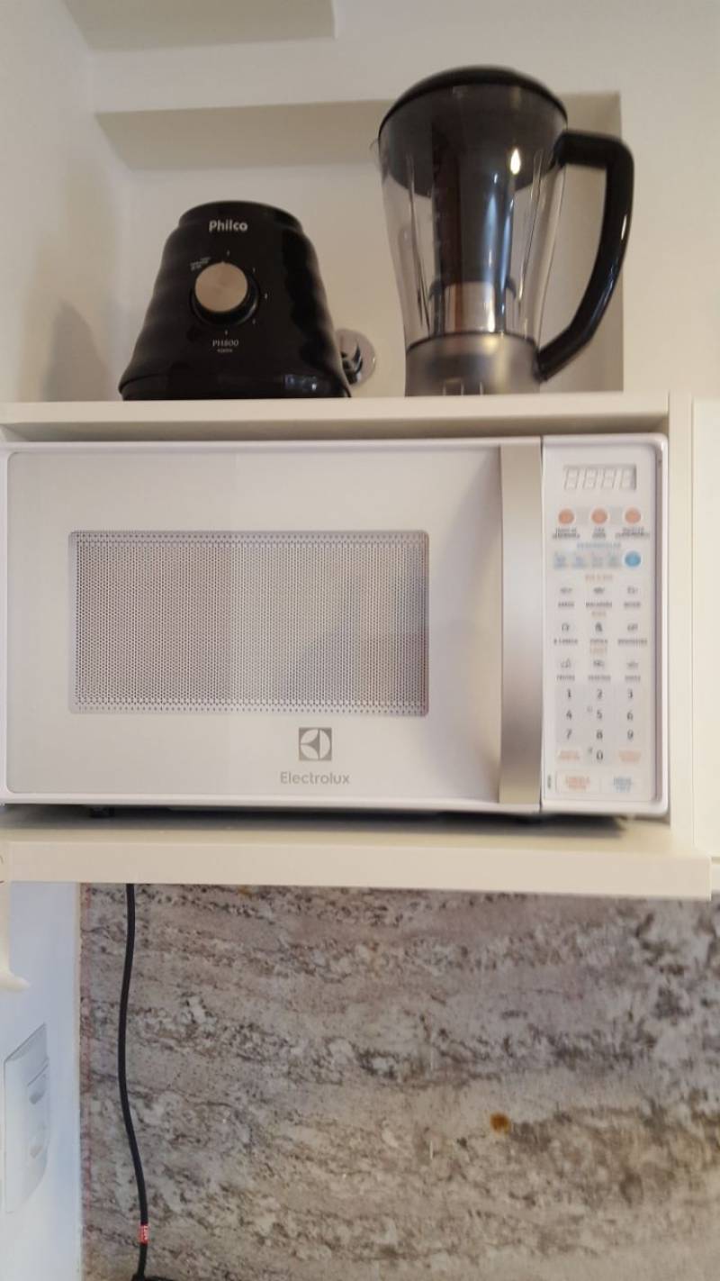 Todo mobiliado: armários no quarto, banheiro e cozinha, geladeira, fogão elétrico de mesa, microondas, liquidificador, cafeteira, torradeira, utensílios para cozinha (pratos, talheres, copos e panelas), mesa com duas cadeiras, sofá-cama, TV na sala.